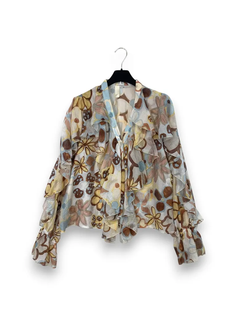 Description Camicia alla coreana scollo a V con volant sul profilo in fantasia floreale