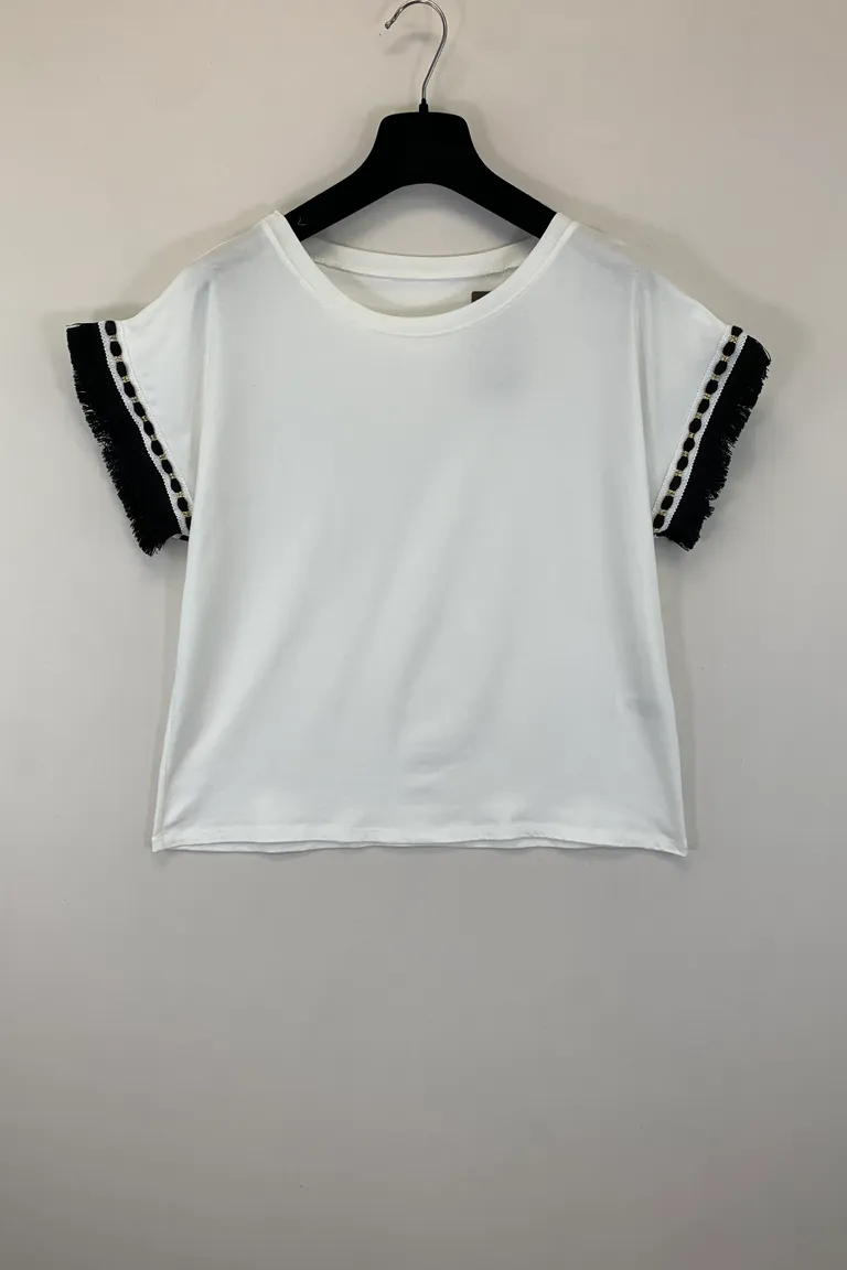 Description Maglietta mezza manica con frange e ricamo al giro manica