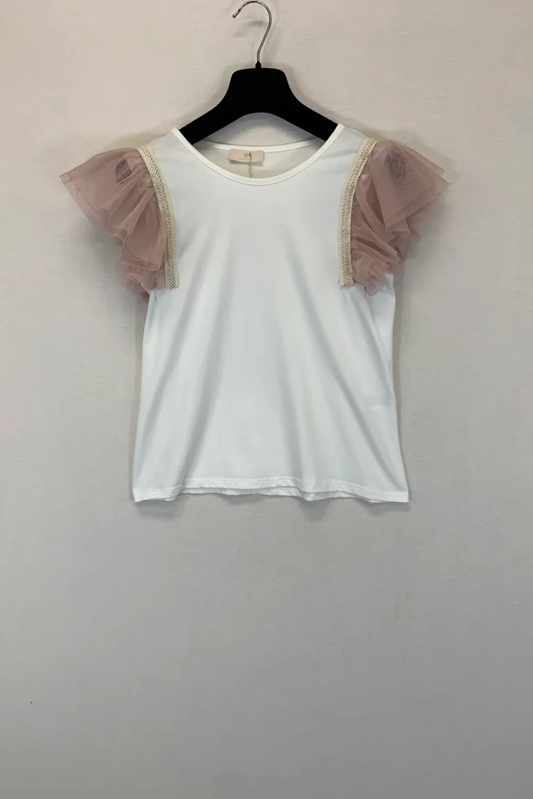 Maglietta manica volant in tulle e ricamo