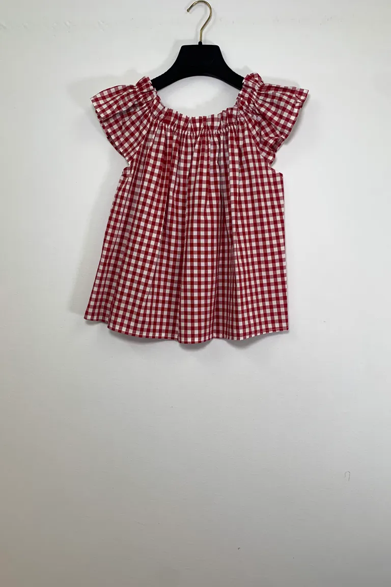 Description Maglietta a quadri con scollo a barchetta arricciato