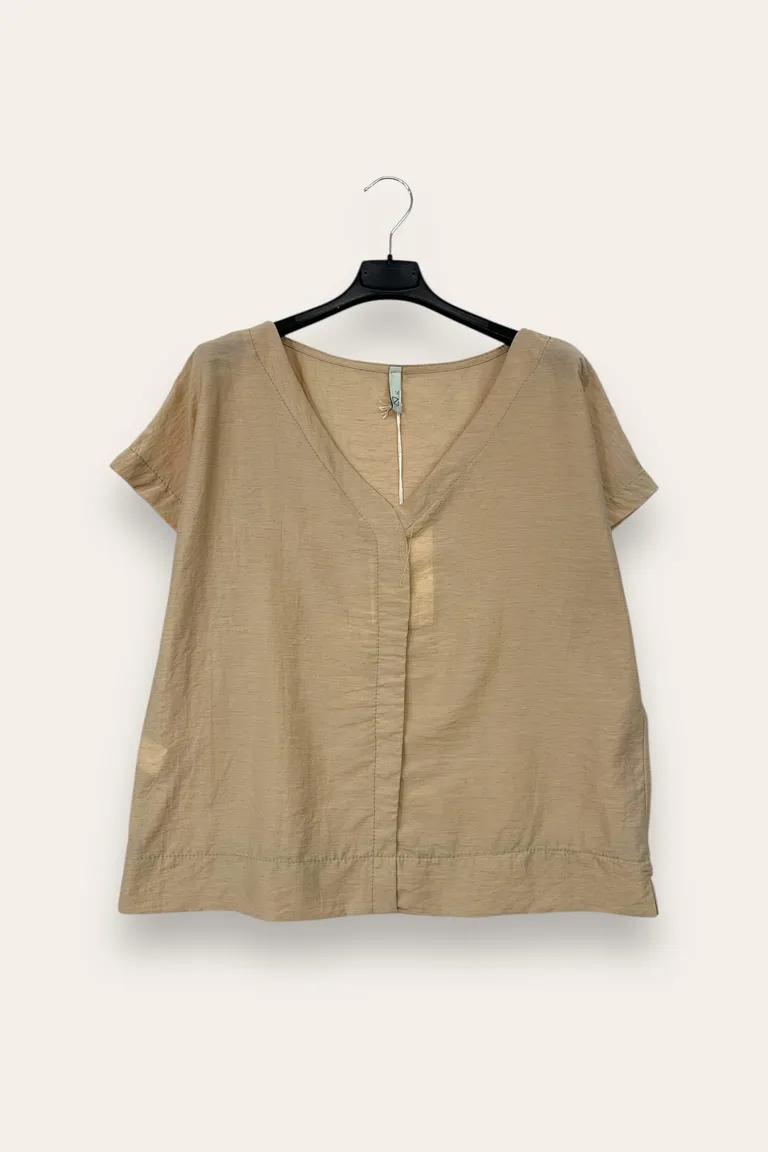 Description Blusa scollo a V mezza manica, misto lino