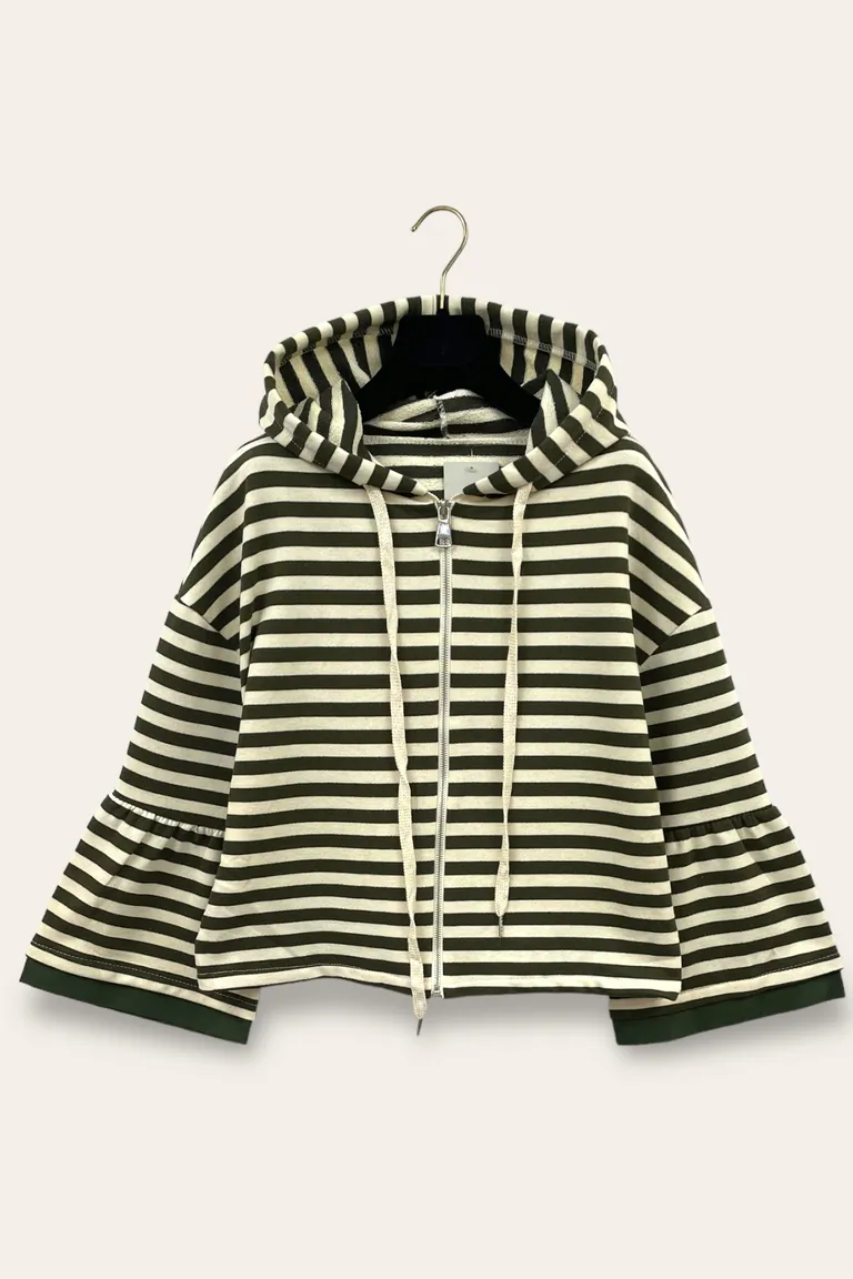 Description Felpa rigata con zip, cappuccio e maniche a campana