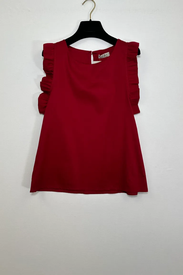 Description Canotta con ruches al giromanica e bottone dietro il collo