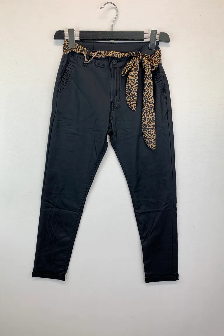 Description Pantalone in ecopelle con ruches alle tasche e fusciacca in raso