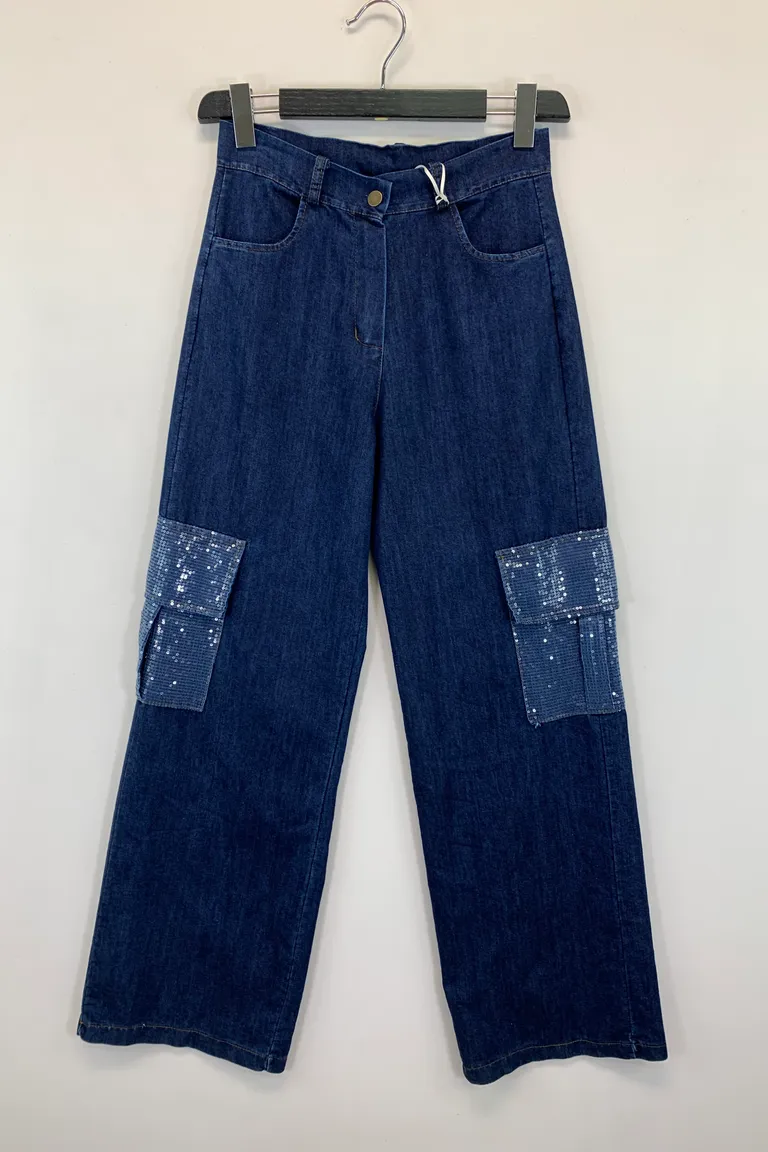 Description Pantalone jeans a palazzo con tasche di paillettes