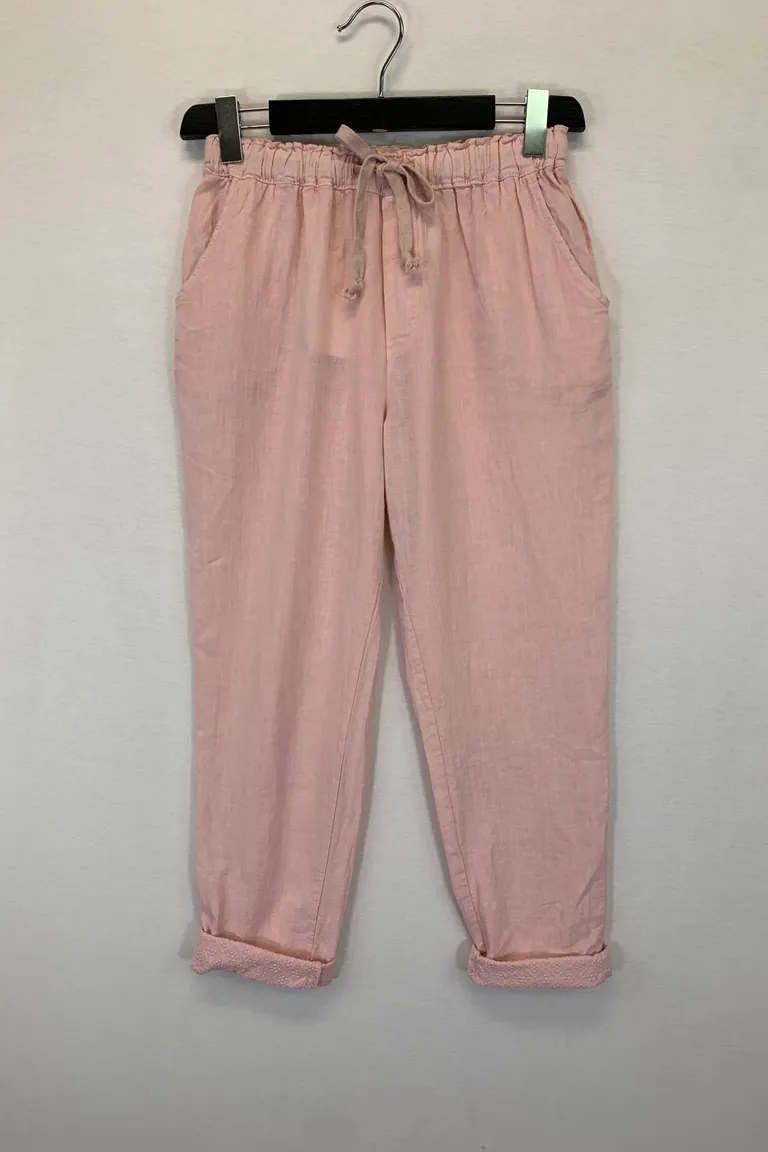 Description Pantalone misto lino con risvolto in sangallo, coulisse ed elastico in vita