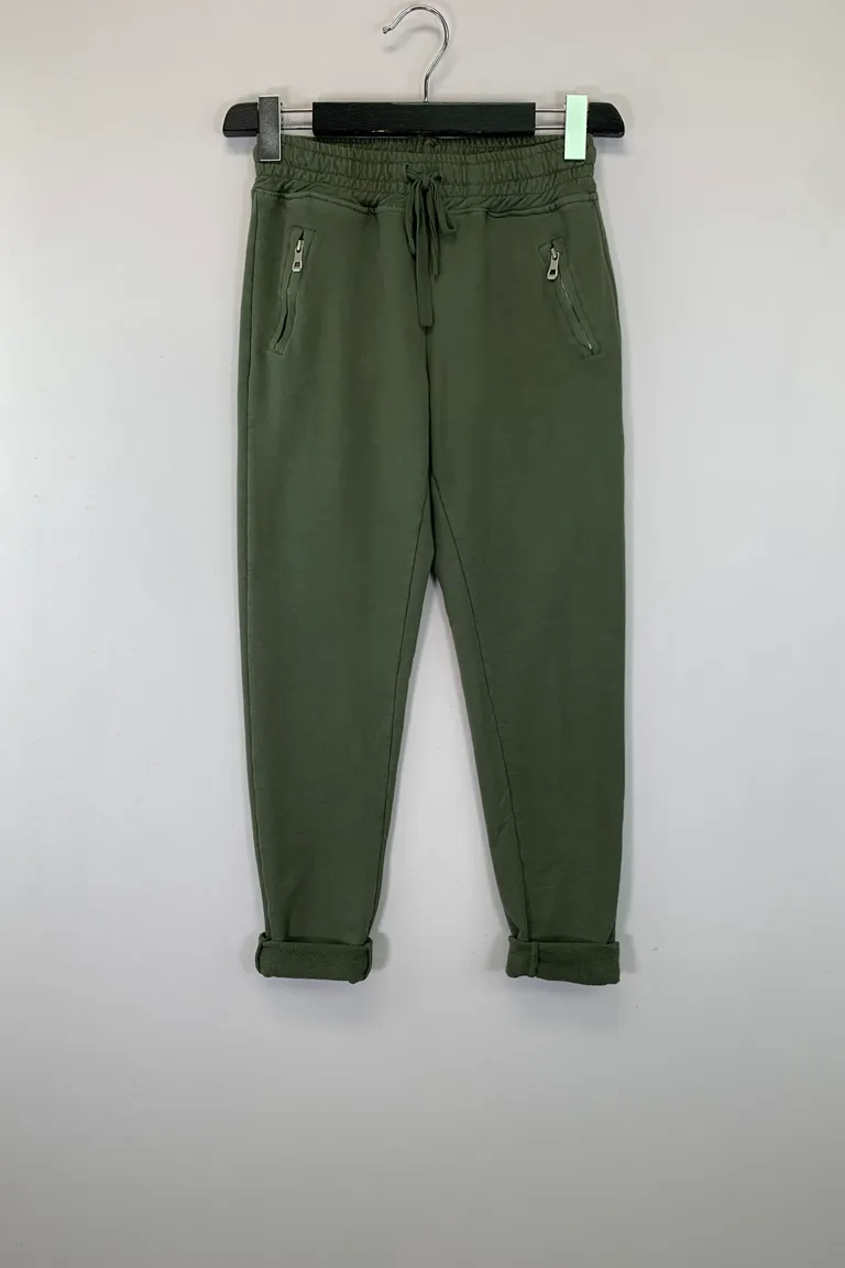 Description Pantalone felpato con zip alle tasche, elastico e coulisse in vita