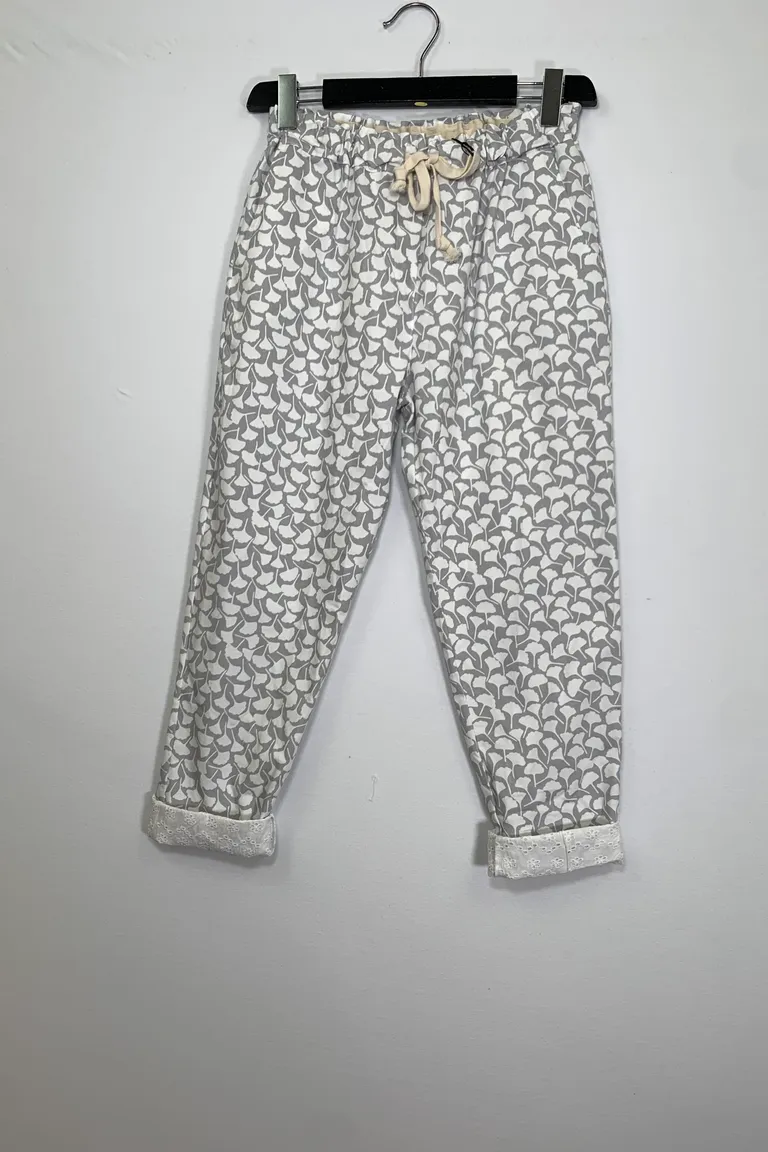 Description Pantalone morbido in fantasia con risvolto in san gallo, elastico e coulisse in vita