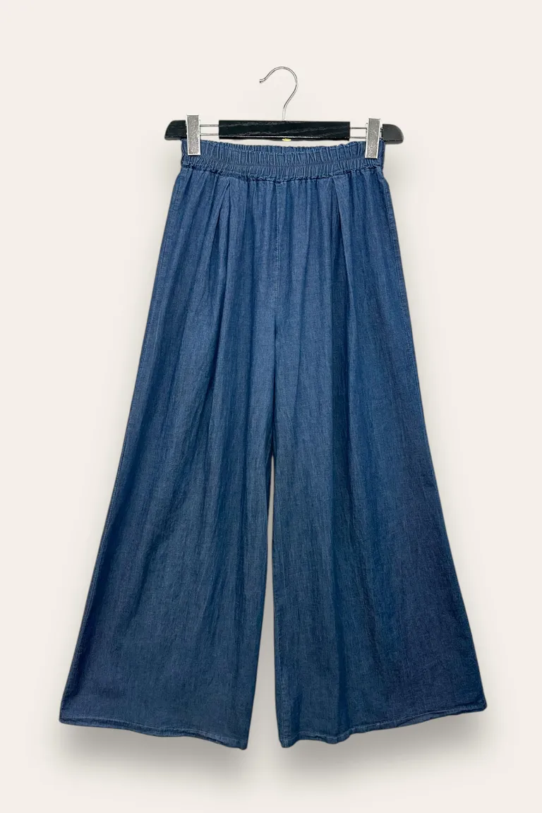 Pantalone chambray a gamba larga, elastico in vita
