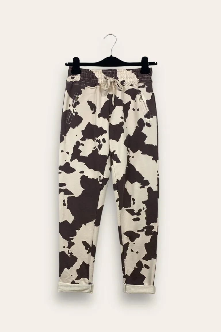 Description Pantalone in felpa con zip alle tasche in fantasia cavallino mucca