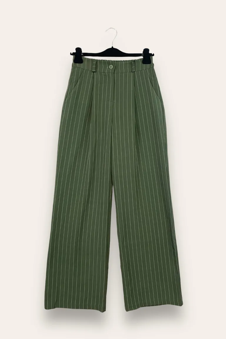 Description Pantalone gessato a palazzo con pences davanti ed elastico retro vita