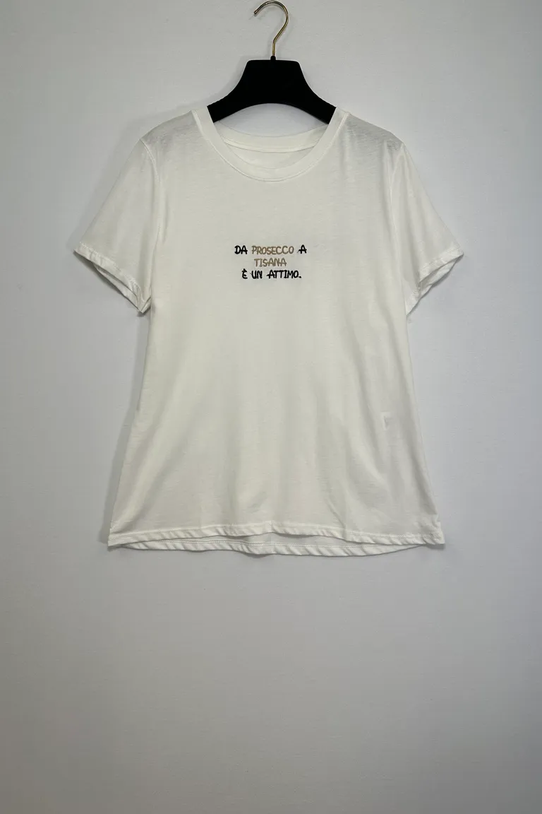 Description T-shirt con ricamo “da prosecco a tisana è un attimo”