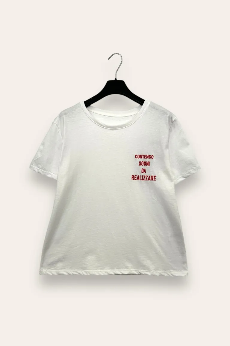 T-shirt con ricamo “contengo sogni da realizzare”