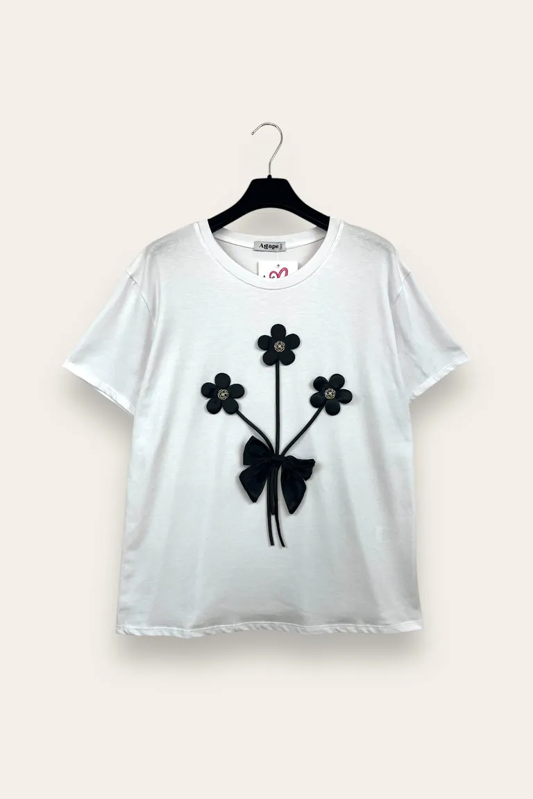 T-shirt con tre fiori e spilla