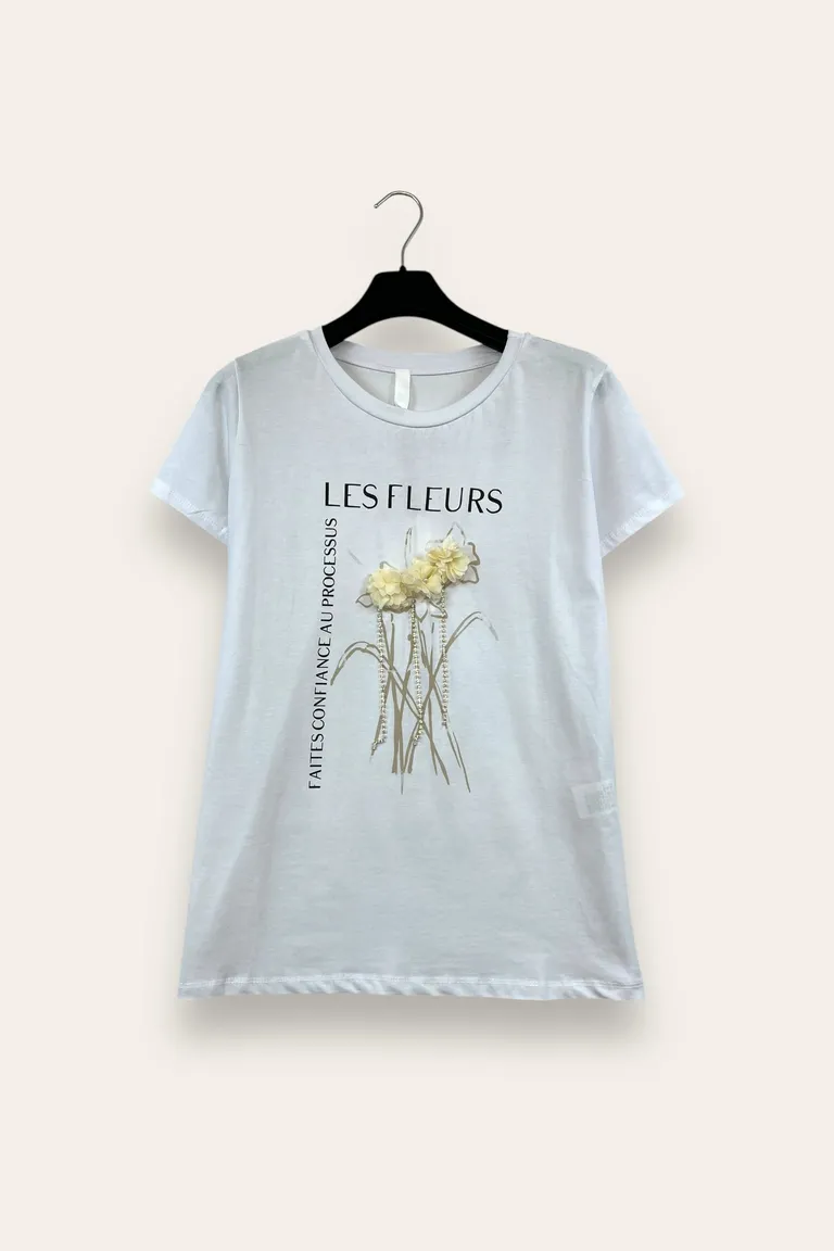 T-shirt con fiori in tulle e scritta “Les fleurs”