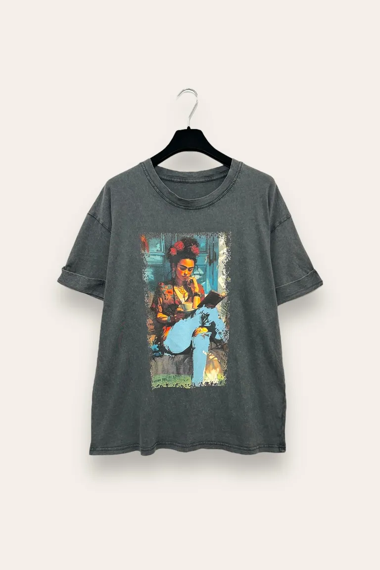 T-shirt stone washed con stampa “frida” con caffè