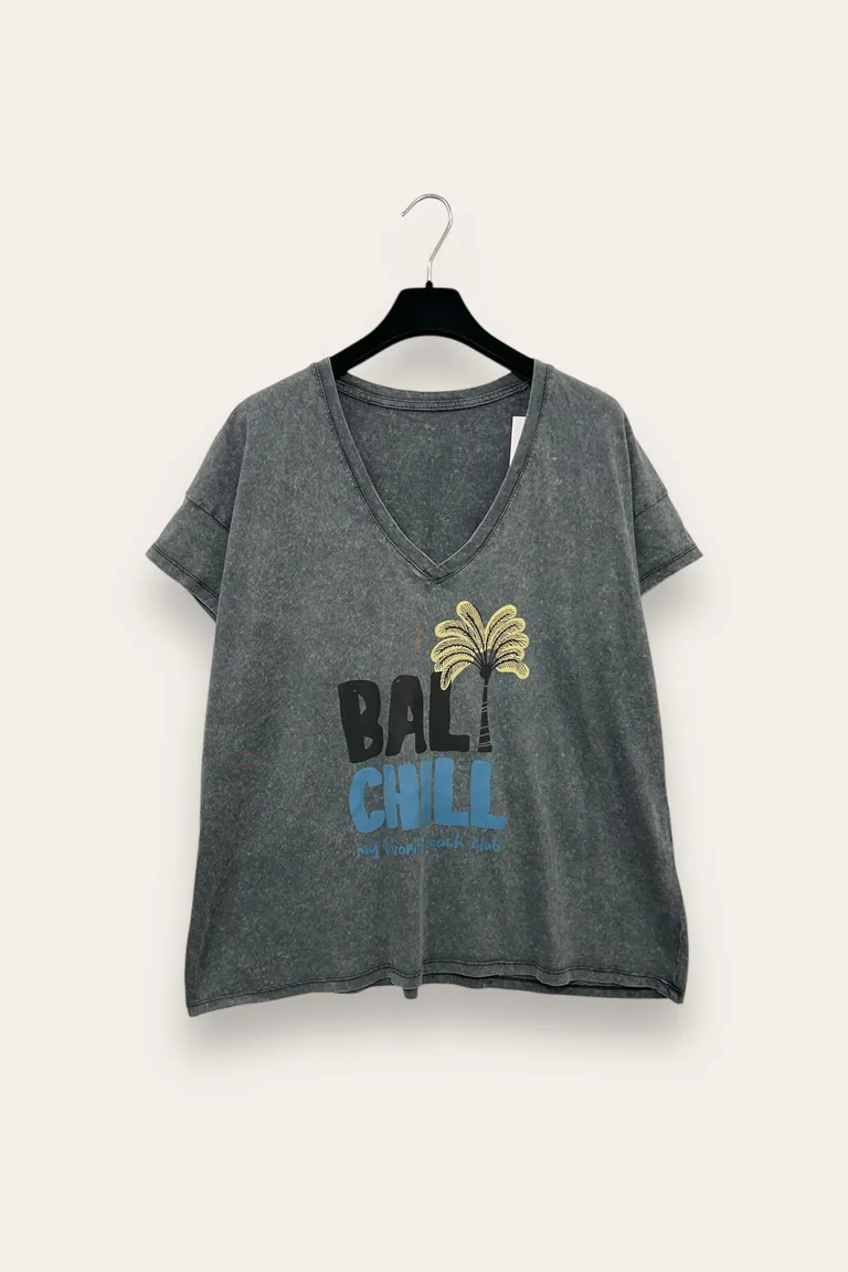 Description T-shirt ampia stone washed con scollo a V stampa palma “Bali chill”
