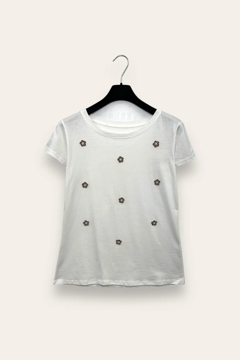 T-shirt con fiori rimacati applicati