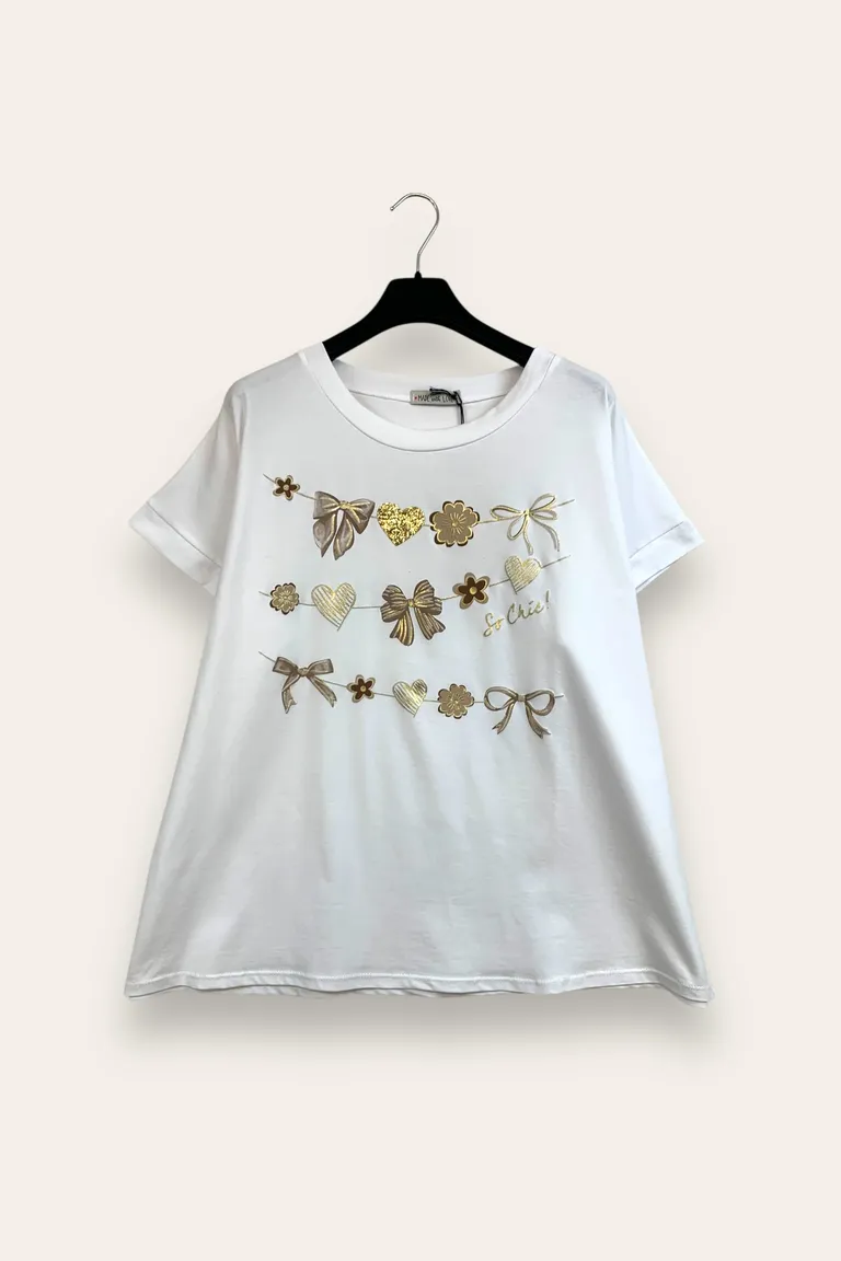 T-shirt over con stampa fiocchetti e fiori satinati