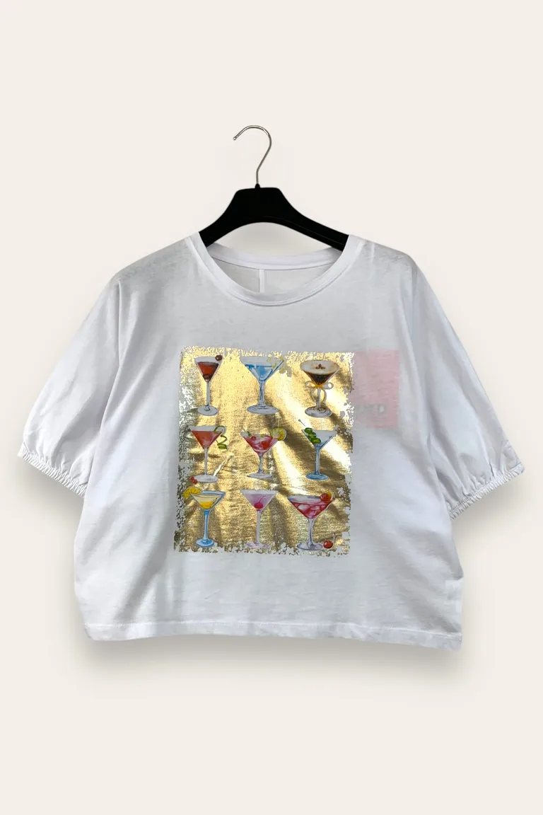 Description T-shirt con stampa bicchieri, manica con elastico e riga dietro