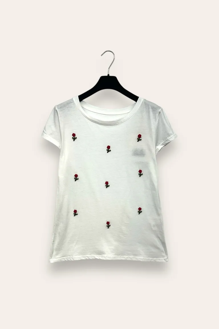 T-shirt con fiori rimacati applicati