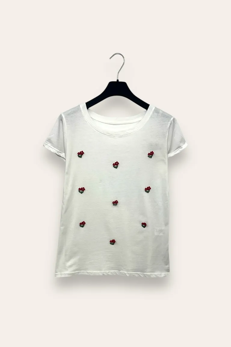 T-shirt con fiori rimacati applicati