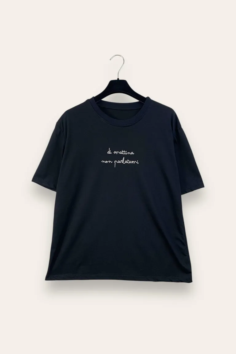 T-shirt con scritta ricamata “ di mattina non parlatemi”