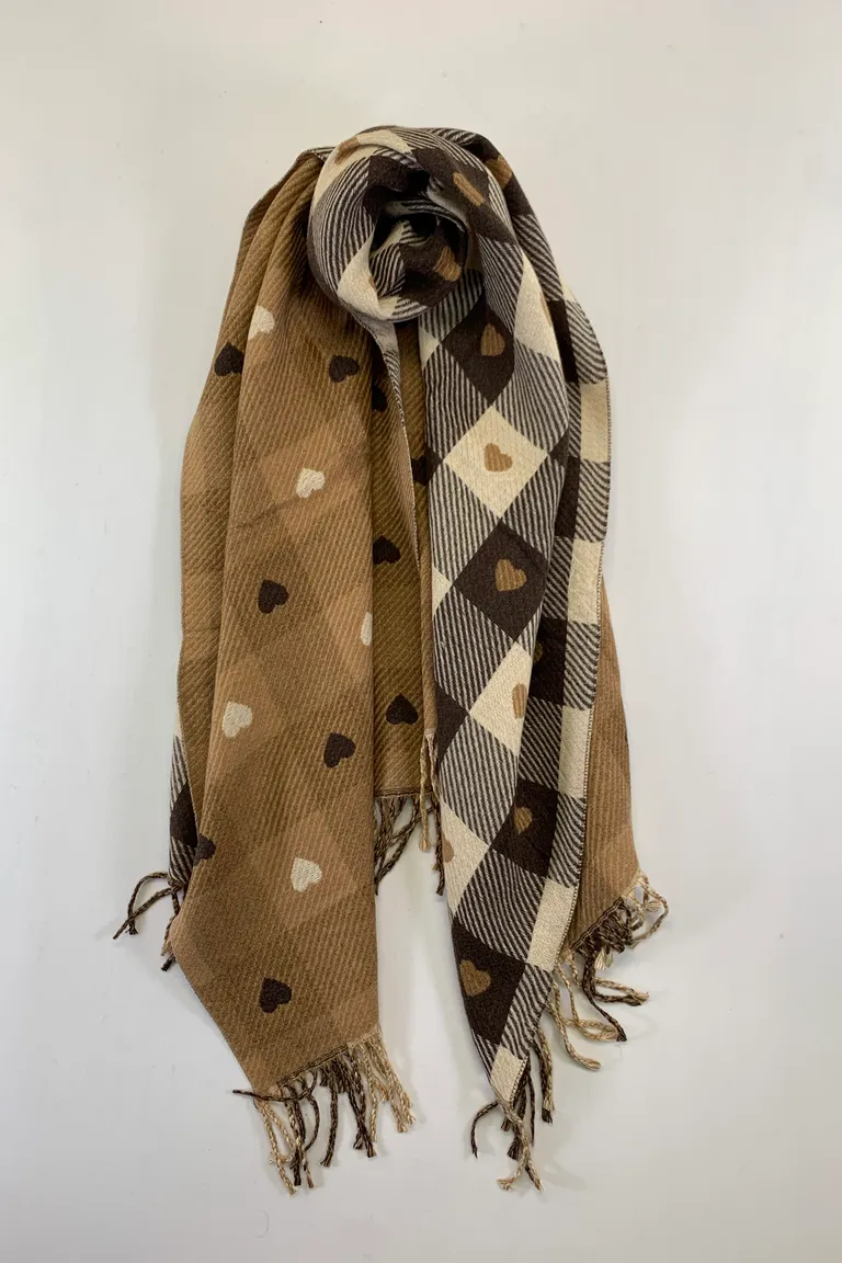 Sciarpa con frange, fantasia quadri e cuori