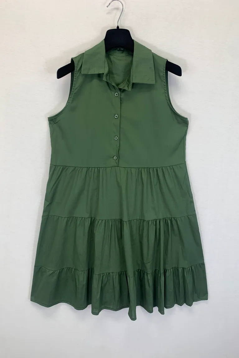 Abito smanicato a balze, bottoni sul petto