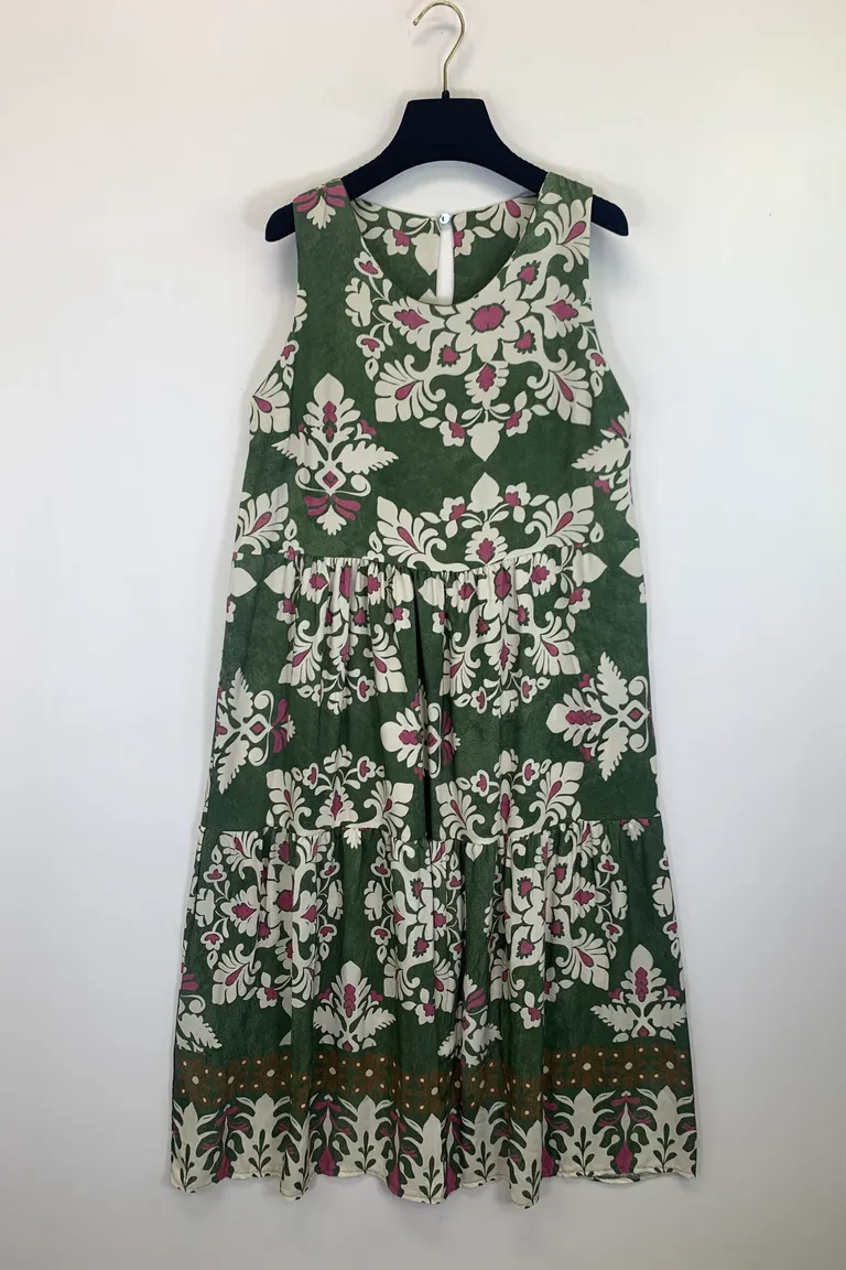 Description Abito smanicato a balze in viscosa, bottone dietro il collo