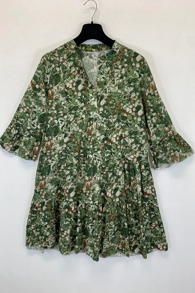 Abito a balze in fantasia, manica 3/4 a campana