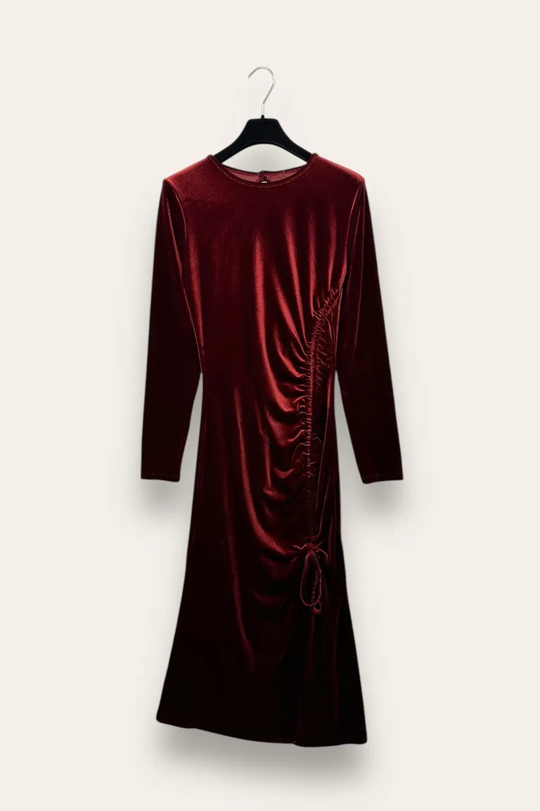 Description Abito lungo in ciniglia con laccio e bottone dietro
