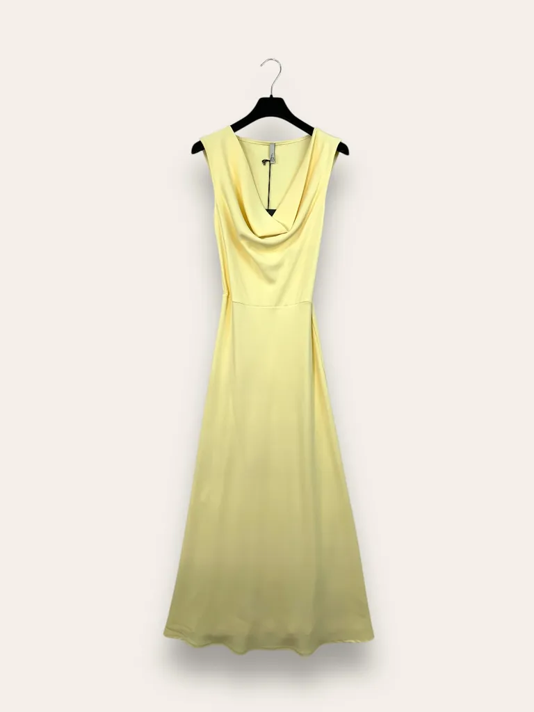 Description Abito lungo scollo morbido rotondo con elastico in vita, tessuto fluido