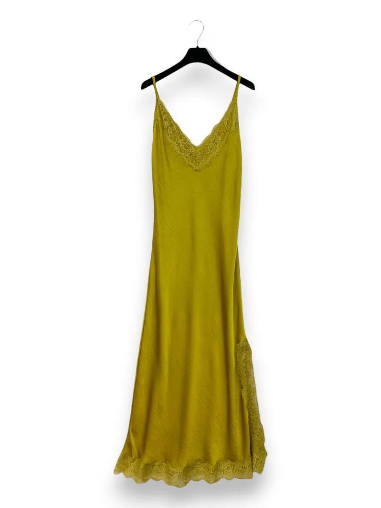 Description Abito lungo in raso con inserti in pizzo e spacco laterale