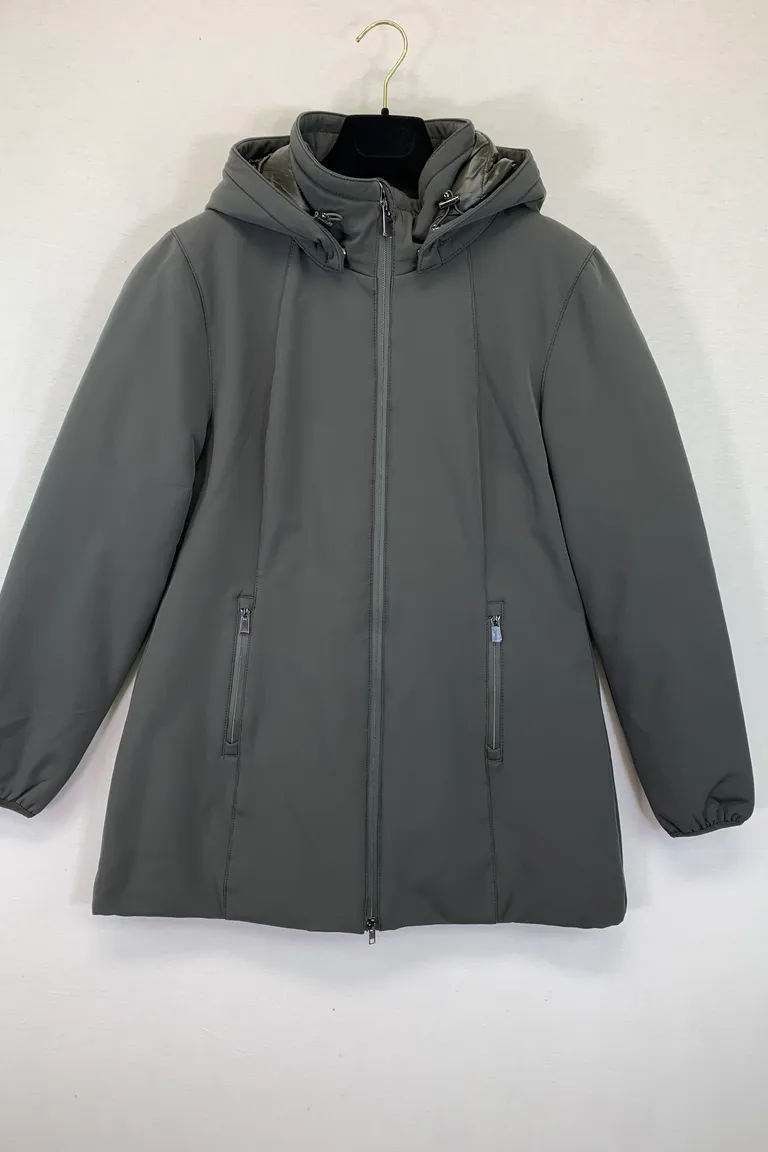 Description Piumino lungo sciancato con cappuccio