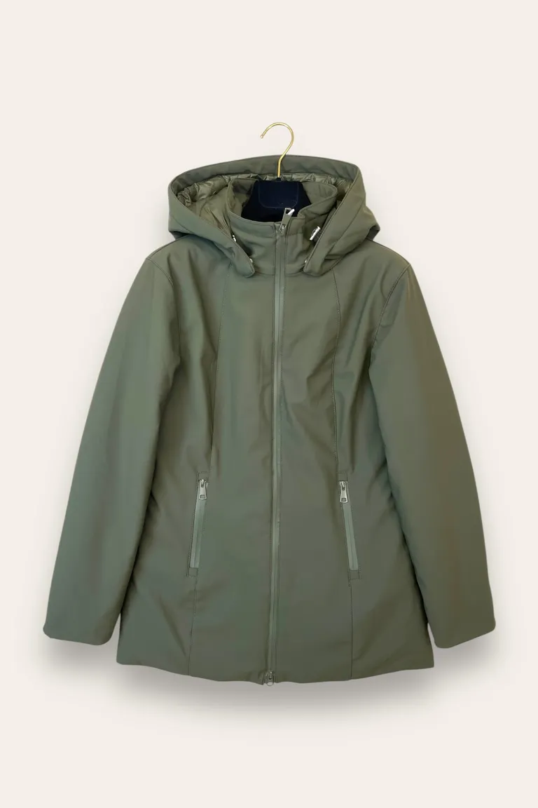 Description Piumino lungo sciancato con cappuccio