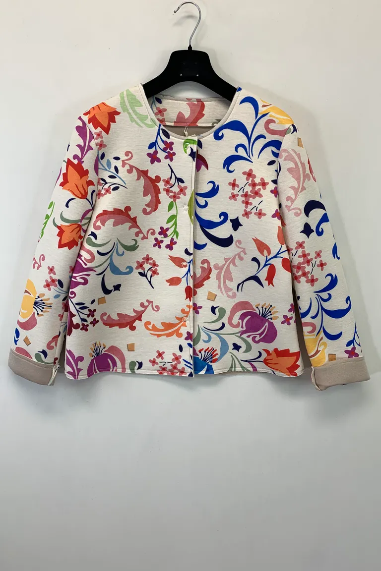 Description Giacca girocollo neoprene in fantasia, con poussoir