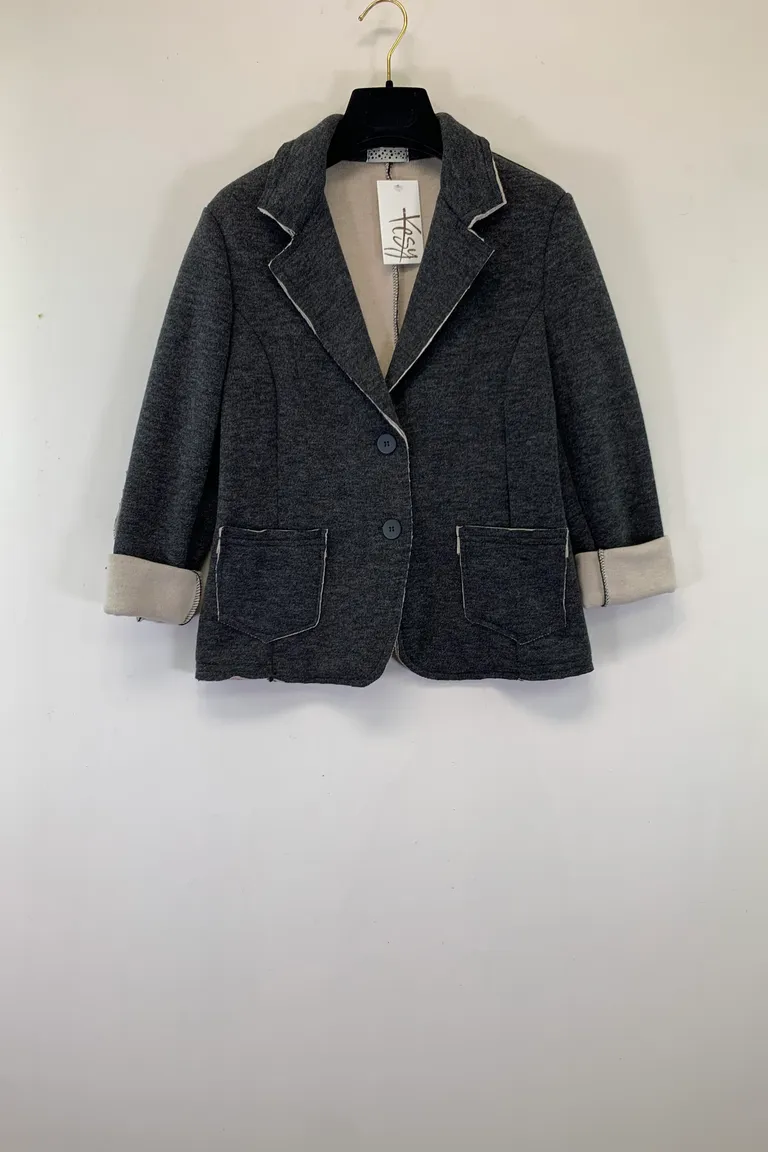 Description Giacca in lanetta taglio vivo, con toppe ai gomiti