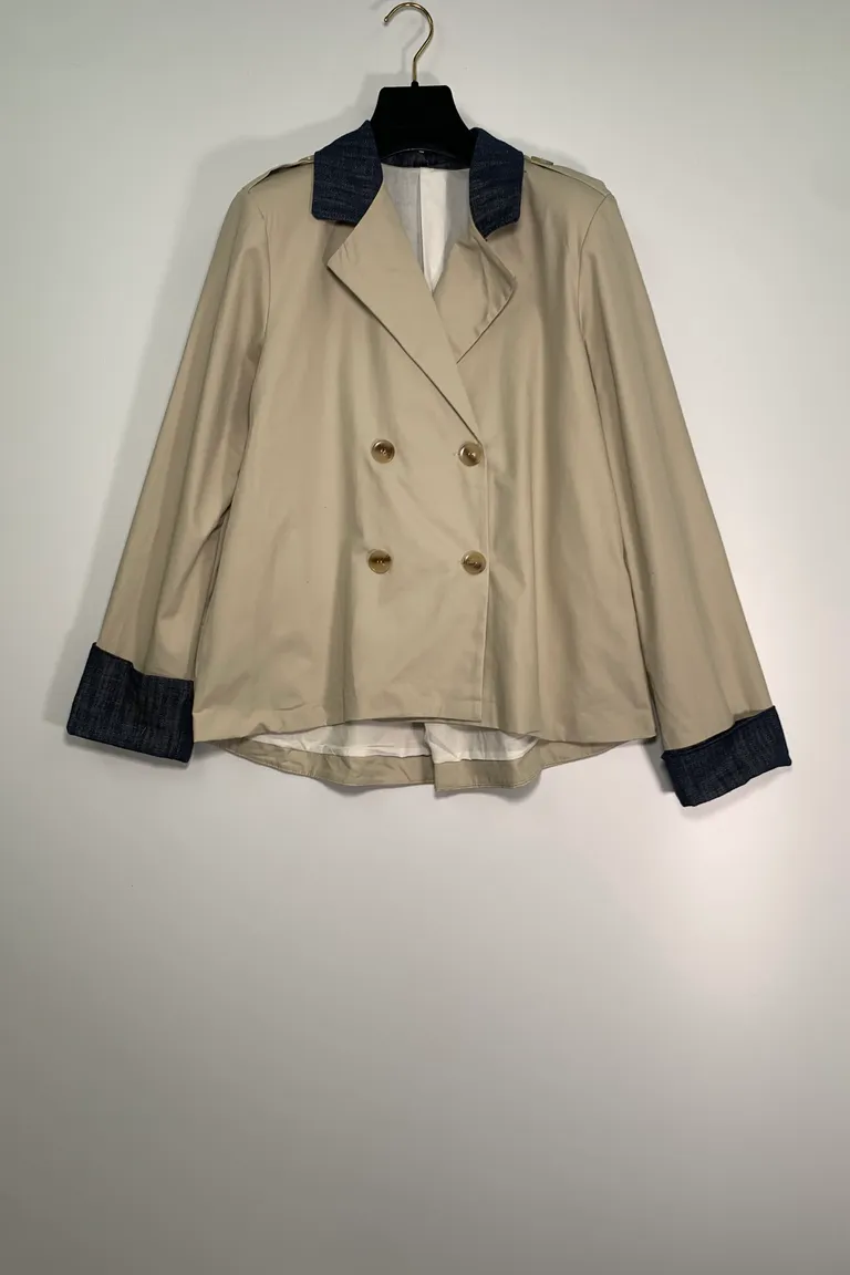 Description Giacca doppiopetto foderata, con inserti in jeans
