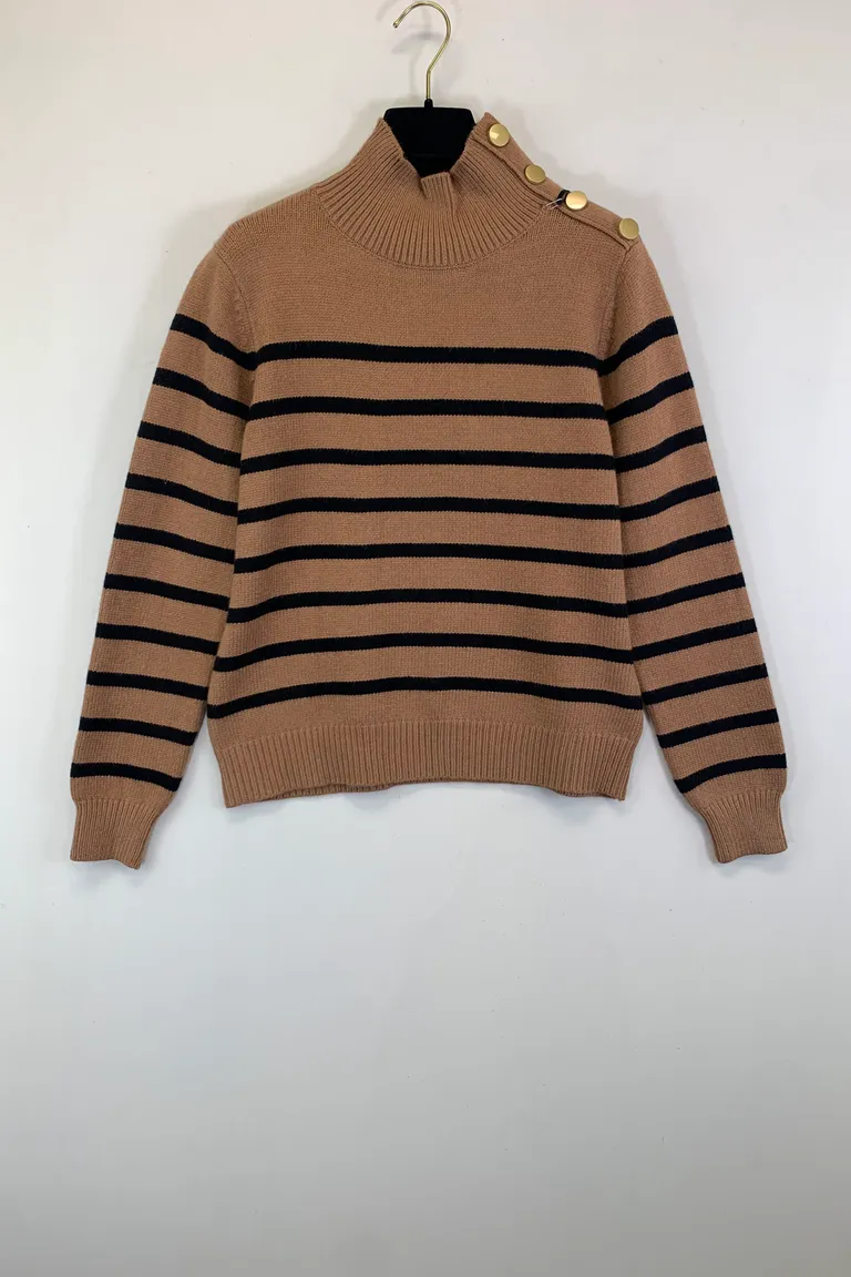 Description Maglia lupetto a righe, con bottoni decorativi sulla spalla