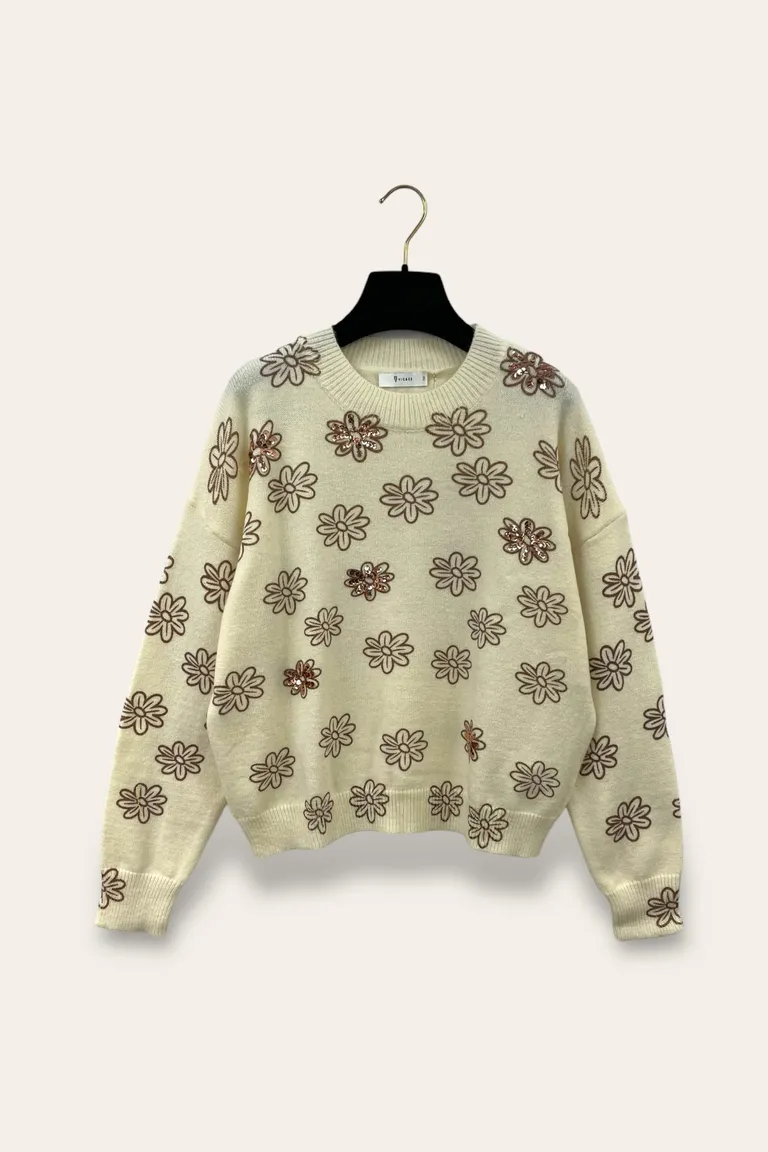 Description Maglia girocollo con fiori stampati e paillettes