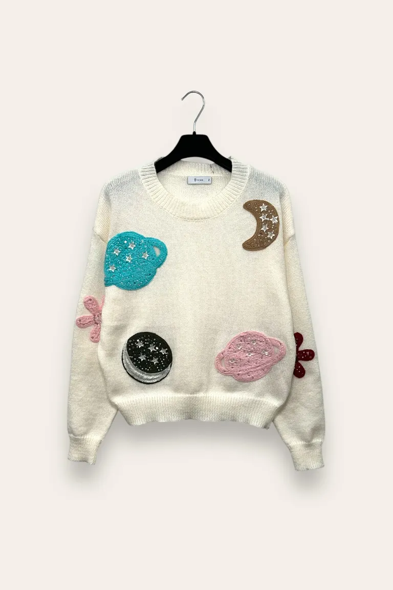 Description Maglia girocollo con pianeti ricamati, perle e paillettes