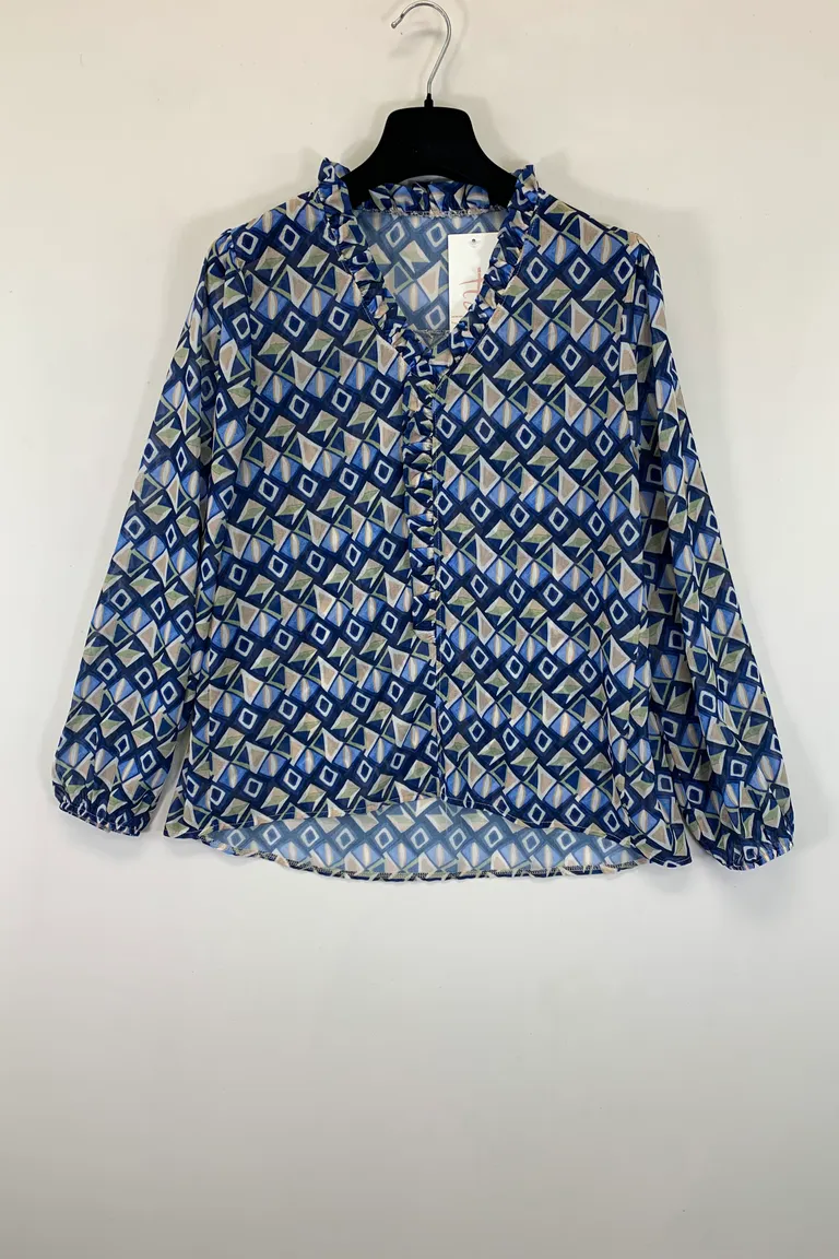Description Blusa in georgette in fantasia, con volant arricciato sul davanti