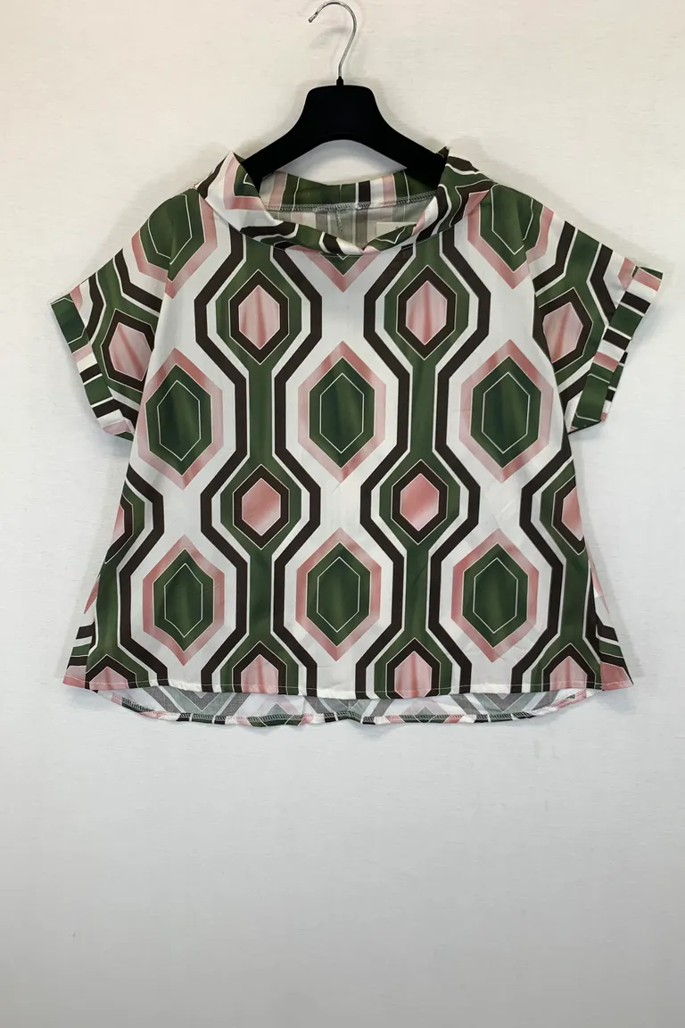 Description Blusa mezza manica con scollo a ciambella, in fantasia