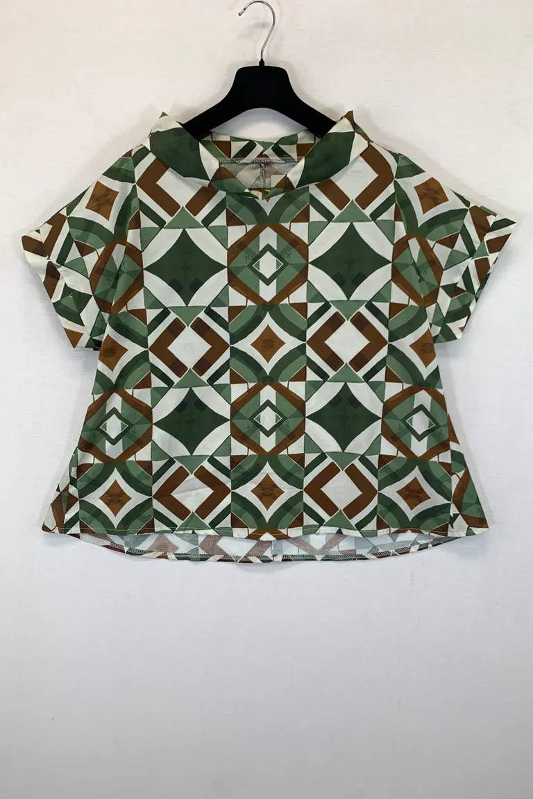 Description Blusa mezza manica con scollo a ciambella, in fantasia