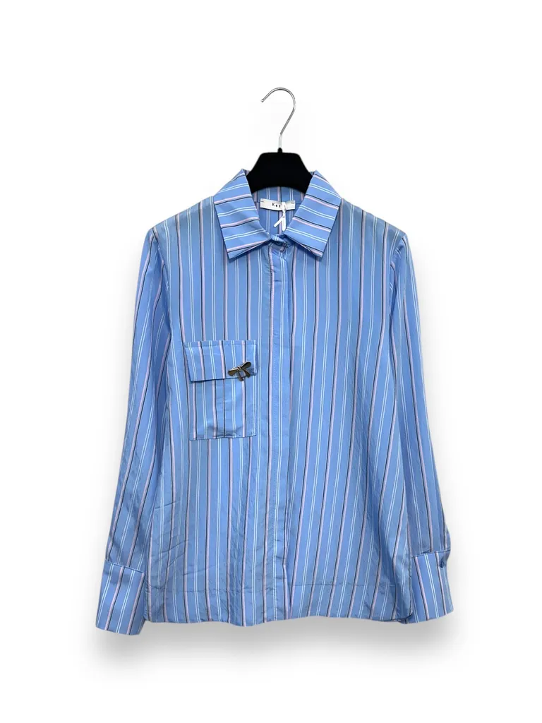 Description Camicia a righe in viscosa, con taschino e spilla