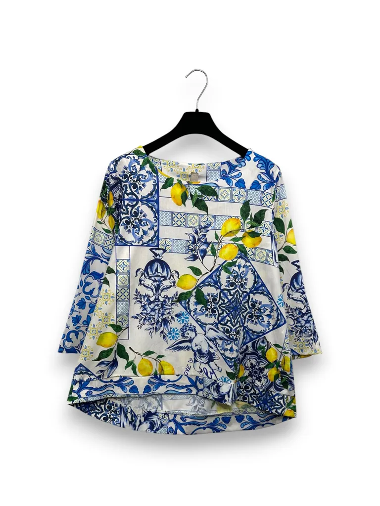 Description Blusa in cotone fantasia limoni, manica a 3/4