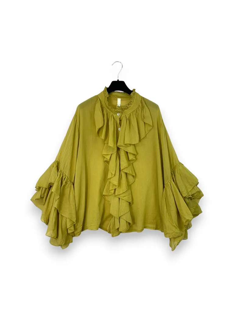 Description Camicia in mussola di cotone con volant e maniche a campana a balze