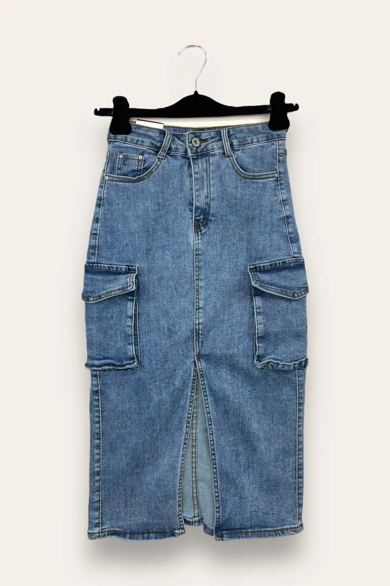 Description Gonna in jeans cargo con spacco frontal
