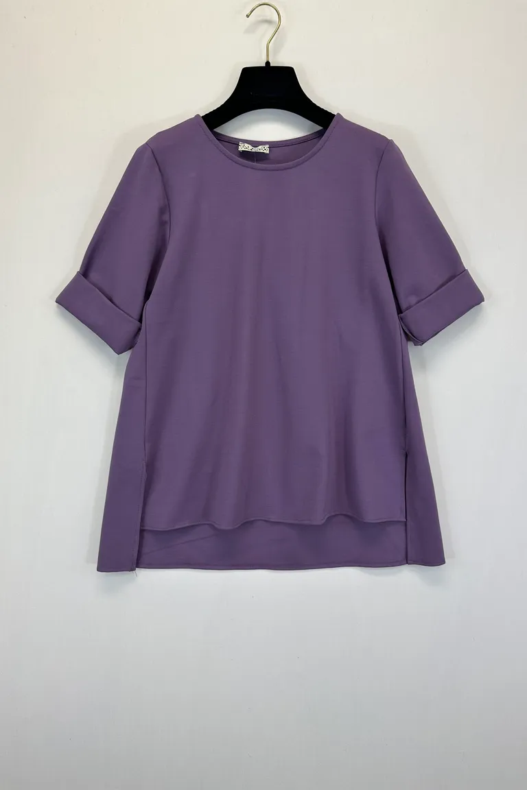 Description Blusa lunga girocollo punto milano, spacchetti ai fianchi